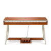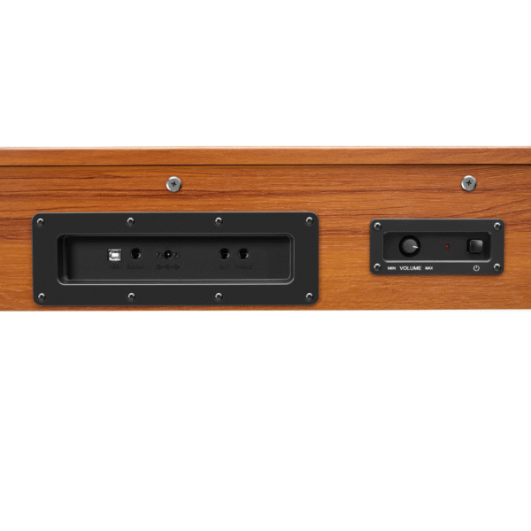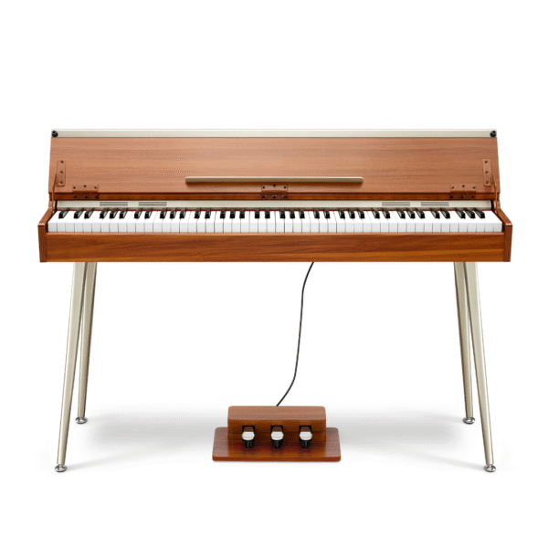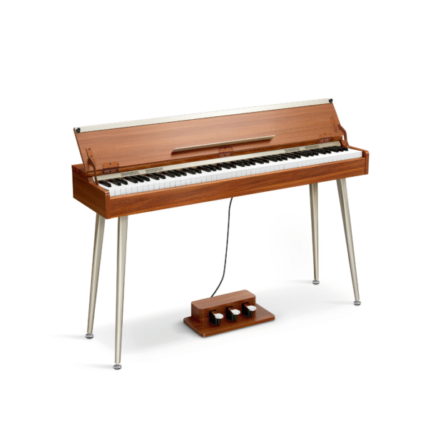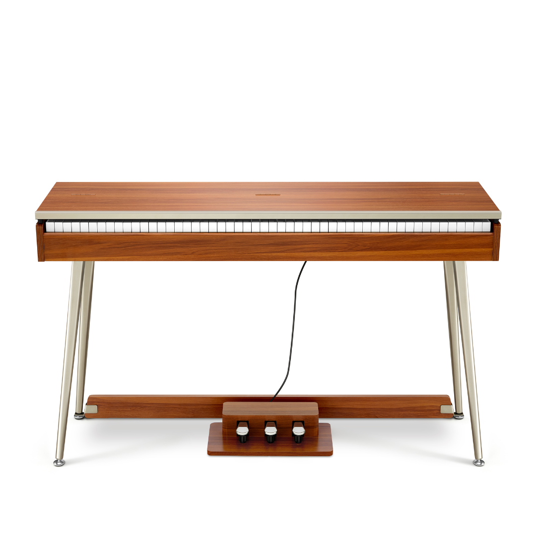 外型以木質紋理搭配金屬飾條,極簡美學風格融入居家空間,兼具鋼琴與家飾功能。