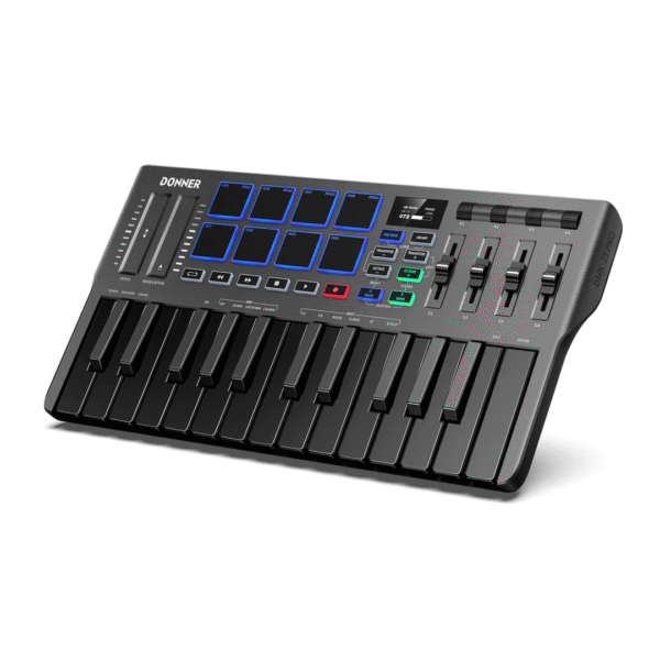 Donner DMK-25 PRO 迷你鍵 MIDI 主控鍵盤,配備 25 鍵、16 種智能音階模式、OLED 螢幕、背光打擊墊與多功能控制輪。支援 USB-C 與 3.5mm MIDI Out,兼容 Cubase、GarageBand 等主流 DAW,輕巧便攜,適合音樂創作與編曲。