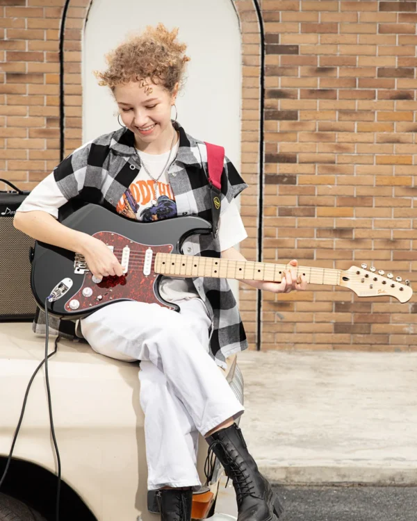 Donner DST-152 電吉他,39 吋全尺寸設計,搭載 SSH 單單雙拾音器與 PUSH-PULL 分離電路,配合五段切換可實現多達 7 種音色模式,涵蓋搖滾、藍調到流行等多元曲風。白楊木琴身搭配楓木琴頸與月桂木指板,手感舒適且音色穩定,適合長時間練習與演出。