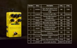 11 種多重調變音色(Chorus, Flanger, Tremolo, Phase, Vibrato, Rotary, Liquid, Auto Wah, Stutter, Ring, Low-bit),7 組預設,立體聲輸入輸出,True Bypass。11 種經典與實驗音色|7 組預設儲存槽|立體聲輸入輸出|True Bypass