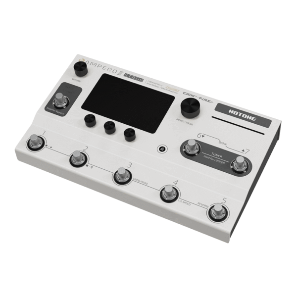 Hotone Ampero-II Stage 舞台型綜合效果器,三核心 DSP 與 ESS® Sabre® AD/DA,內建 460+ 效果、雙音色鏈、5 吋觸控、藍牙與 8 顆腳踏開關。支援 Tone Catch、Celestion 授權 IR、USB 8×8 錄音介面與 5 組 Scene,滿足專業演出與錄音需求。