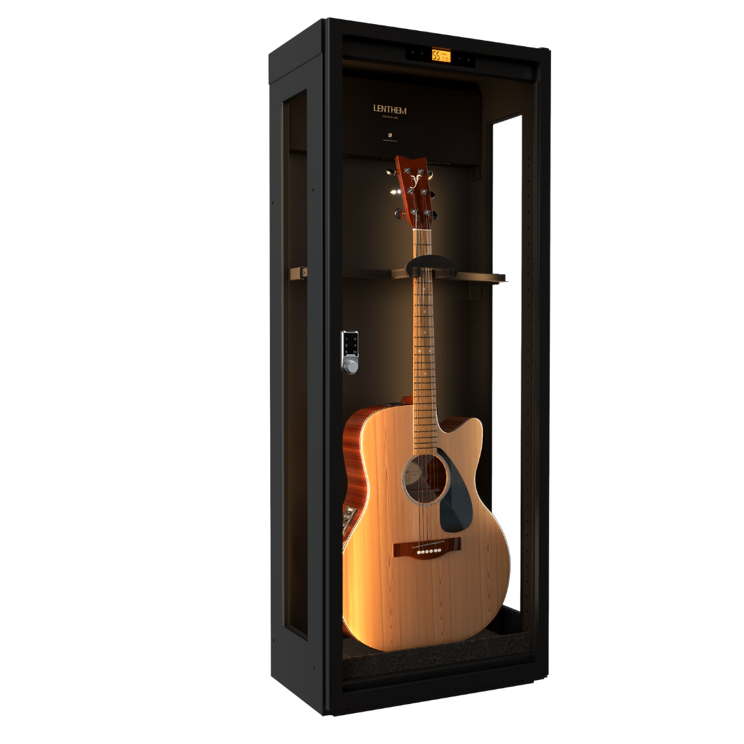 LENTHEM DMI-185DT 為專業級三面玻璃吉他防潮櫃,具備數位濕度顯示與 40–60% RH 可調控範圍,維持最佳樂器保存環境。配置密碼鎖開關與 LED 燈條照明,操作安全便利。採三邊防護、四層耐用結構與六向調節設計,能有效避免碰撞與變形,適合收納 1 把木吉他或電吉他。