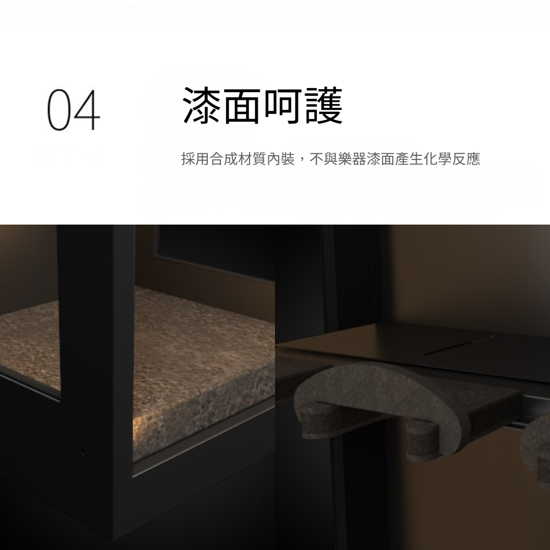 - 底板、頂板與琴頸架使用合成纖維材質,不傷漆面。