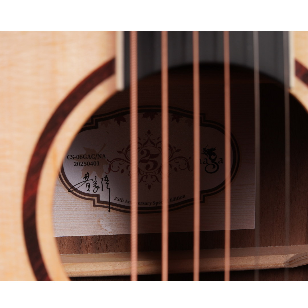CS06 為 NAGA 吉他 25 週年特別款,以「楓葉」象徵時間、季節與初心。設計靈感源於 25 年前的秋天,楓葉見證 NAGA 的成長,也象徵品牌始終如一的熱情、自由與浪漫。