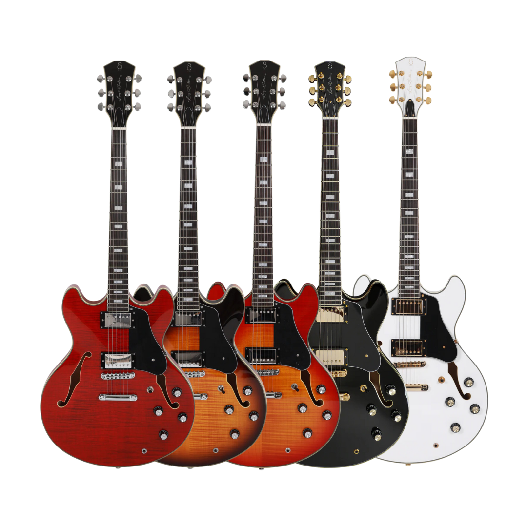 Sire H7V 是 Larry Carlton 聯名的半空心電吉他系列中全新推出的款式,搭載經典雙切角設計與兩顆 LC Vintage P90(Dog Ear)拾音器,保有半空心吉他的自然共鳴與溫潤音色。琴身採用火焰楓木(Flame Maple)面板與楓木(Maple)側背板,中心支撐亦為楓木(Maple),提供平衡音域與良好延音。