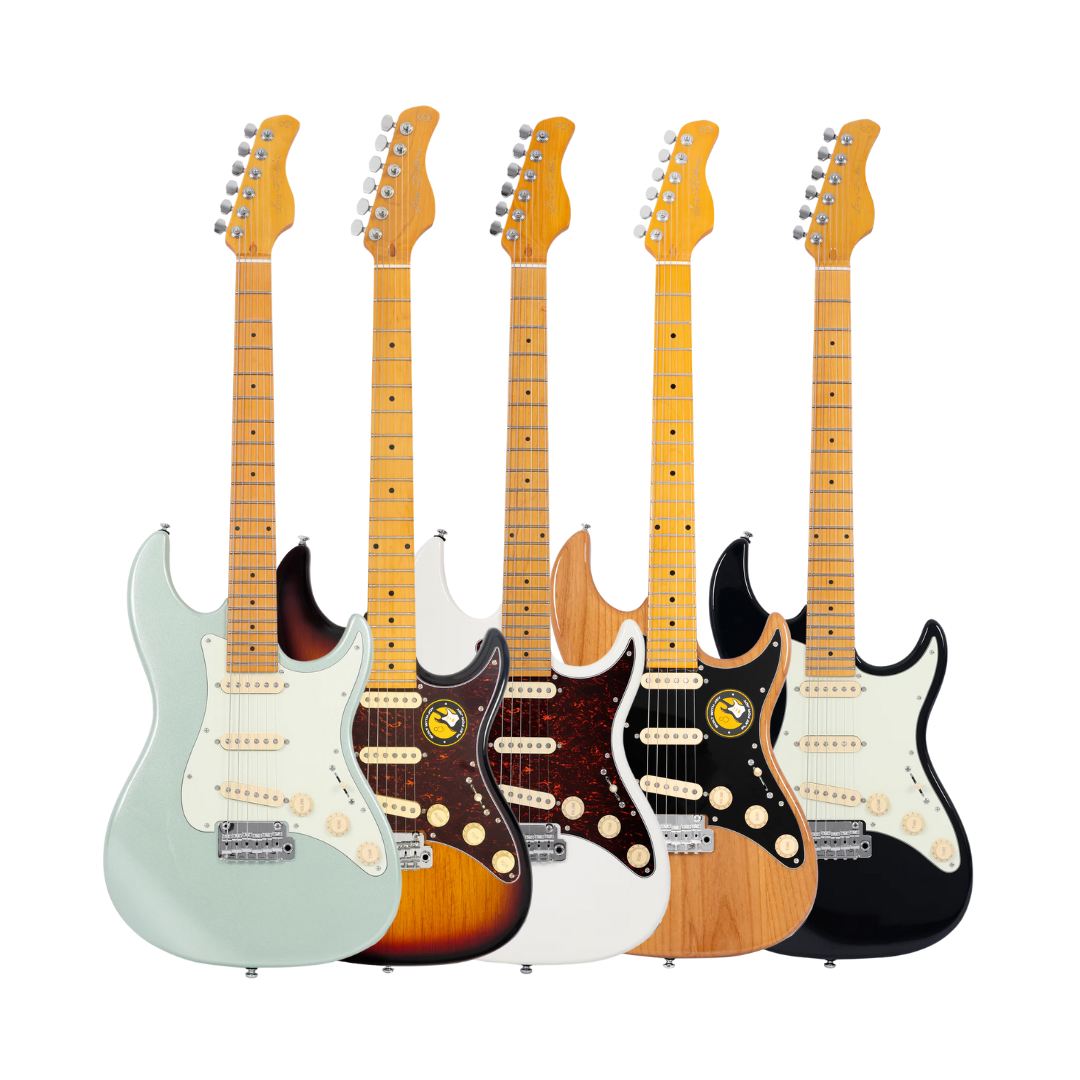 Sire S5 是 Larry Carlton 聯名的全尺寸 S-style 電吉他,採用北美赤楊木(North American Alder)琴身,搭配 C 型硬楓木琴頸與 Edgeless™ 滾邊設計指板,手感滑順自然。三顆 LC Super-V 單線圈拾音器組提供乾淨、明亮的經典 Strat 音色,忠實再現 Larry Carlton 的音色特性。