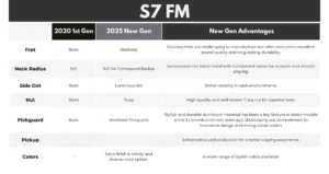 New Gen 頸型包含不鏽鋼 fret、Graphtech Tusq XL 弦枕與複合弧度指板,結合 EDGELESS™ 滾邊設計與 Lumilay 夜光側點,手感與穩定性同步提升。護板採鋁質金屬搭配對應色系,是一款兼顧實用性與視覺美學的全能演奏樂器。