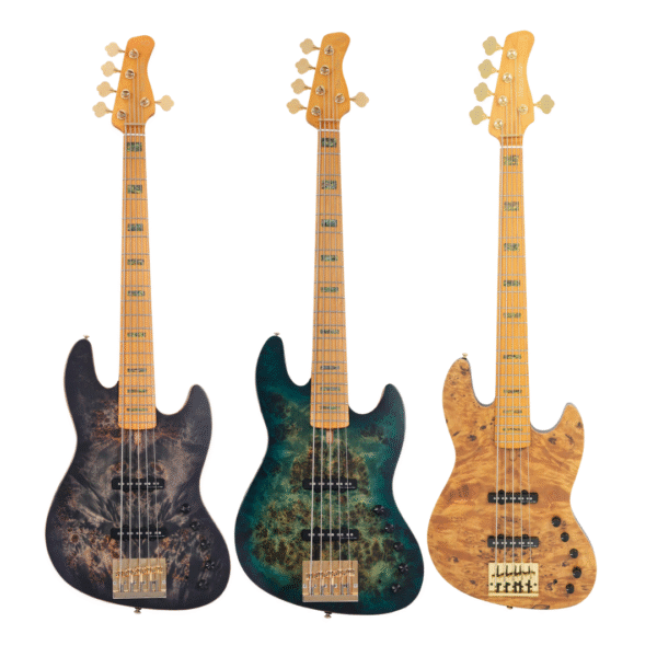 Sire V10 以沼澤梣木琴體結合黃楊瘤木面板,搭載 60 年代拾音間距的 Marcus Super-J Revolution 拾音器組與 Heritage-3 三段 EQ 前級,提供平衡共鳴、延音優異的音色。五弦設計滿足更多演奏需求,並配備金色硬體與 Heavymass II 琴橋,外觀與手感同樣高級。