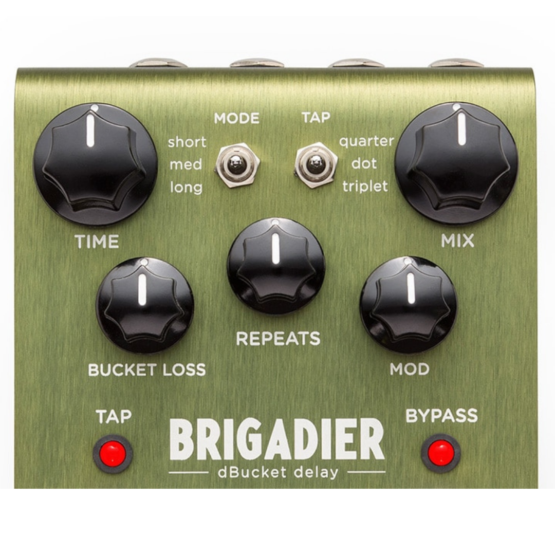 Brigadier 採用類比乾訊號路徑(Analog Dry Path),確保延遲混合時無延遲與失真。24-bit/96 kHz 轉換搭配 32-bit 浮點運算,提供錄音室等級解析。可選真旁通或 Trails 緩衝模式,具 +/− 3 dB Boost 與 Expression 踏板控制。內部跳線支援 TRS 立體聲輸入,兼容單聲道或雙輸出應用。