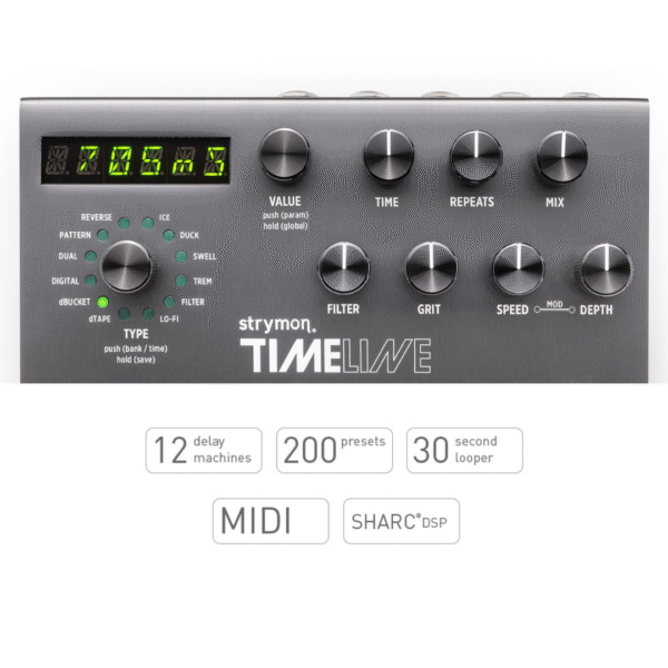 Strymon TimeLine 集結十二種錄音室等級延遲演算法與 30 秒立體聲 Looper,搭載 SHARC DSP 晶片與 24-bit/96kHz 高解析音質,支援 200 組可命名預設與完整 MIDI 控制。支援表情踏板、外部迴路、Trails 延音模式與 Feedback Loop 設計。