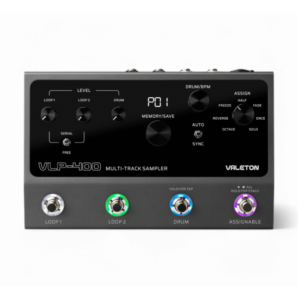 Valeton VLP-400 Looper 節奏機效果器,升級雙迴圈設計,支援 Serial/Free 播放模式、疊錄、同步鼓機與 7 種效果。提供 32-bit/48kHz 高音質錄音,99 組存檔、12 小時錄音空間,並具備 MIDI、USB 與外接踏板控制,滿足現場與創作需求。