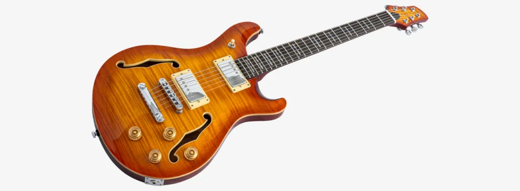 Sire Larry Carlton Q7 Hollow 想要有空氣感又不回授的那種聲音作者: 張 凱威 / 2026-03-03 在吉他圈裡,「半空心」常常會讓人直接聯想到 ES-335 那種有實心中樑(Center Block)的結構;但 Sire Q7 Hollow 走的不是那條路。它的官方規格寫得很清楚:Full Chambered Body——更精準的中文應該叫 「全挖空琴身/腔室挖空結構」。簡單說:你會得到更明顯的空氣感與共鳴,但聲音輪廓仍然清楚,破音或效果器堆疊也更容易掌控,屬於「有共鳴、但不回授」的那種個性。 Full Chambered Body——更精準的中文應該叫 「全挖空琴身/腔室挖空結 全挖空琴身+硬楓木實心拱面:共鳴更開、輪廓更清楚Q7 Hollow 的琴身核心是 桃花心木(Chambered),並做成 Sire Q Shape 的 Full Chambered Body;也就是整體大量挖空、把琴身做成腔室結構。這會帶來兩個很直接的感受:背起來更輕鬆:長時間練團或演出,肩膀真的有差。聲音更有呼吸感:乾淨音色時會更溫暖、更有「空間」。同時,它又加上 硬楓木實心拱面(Solid Arch Top),這點很關鍵:拱面讓聲音的「邊緣」更俐落,低頻不容易糊,單音更容易站在前面。再搭配火焰紋貼皮,外觀走精品路線,還有 Amber Burst/TBK 透明黑/TBL 透明藍 三色可選。 全挖空琴身+硬楓木實心拱面:共鳴更開、輪廓更清楚 Set-in 接柄+25 吋弦長:延音扎實、手感更均衡琴頸是 桃花心木 C 型,搭配 Set-in Neck(黏接式接柄),手感回饋偏扎實,延音也更有信心。弦長採 25 吋,張力比 24.75 吋多一點點:刷和弦更穩、低弦更清楚,推弦也不會太軟。這種配置很適合「需要乾淨音色質感、也常用破音」的玩家,怎麼彈都不會覺得鬆散。 Set-in 接柄+25 吋弦長:延音扎實、手感更均衡 黑檀木 Edgeless™ 滾邊指板:換把順、手感像已磨合好的琴指板是 黑檀木,並加入 Edgeless™(Rolled Fretboard Edges)滾邊。這不是花俏名詞,而是很直接的「手感加分」:換把位、滑音、封閉和弦移動時,邊緣不刮手,越彈越舒服。搭配 10 吋指板弧度、22 格、0.27 公分 Medium Jumbo 品絲,屬於大多數人上手快、也能兼顧和弦與主奏的實用配置。再加上 牛骨上弦枕(寬 4.3 公分),音色與穩定度也更到位。 黑檀木 Edgeless™ 滾邊指板:換把順、手感像已磨合好的琴 LC Q 雙雙線圈+雙音量雙音色:現場切換更快,細節更好雕拾音器是 LC Q Humbucker(H-H),走「厚度夠但不悶」的方向。更實用的是它的控制方式:三段切換+Neck/Bridge 各自 Volume、Tone(雙音量雙音色)。這讓你可以先把兩顆拾音器各自調成不同性格,例如:Neck:溫暖厚實,適合和弦、旋律線Bridge:更明亮、穿透,適合節奏或主奏 LC Q 雙雙線圈+雙音量雙音色:現場切換更快,細節更好雕 Tune-O-Matic+鋁製 Stop Tail+鎖定弦鈕:走音風險更低、換弦更省事硬體配置也很偏「舞台取向」:Sire Modern Tune-O-Matic 琴橋+鋁製 Stop Tail,音準好調、延音自然;再配上 Premium Locking Tuner 鎖定弦鈕,換弦速度更快、拉扯更穩,演出前後的心累會少很多。五金為 鍍鉻,耐看也好保養;而且 無護板設計讓整體線條更乾淨俐落。 Tune-O-Matic+鋁製 Stop Tail+鎖定弦鈕:走音風險更低、換弦更省事 最後要說它不是典型半空心,但你會愛上它的「共鳴感+可控度」如果你想要的是:更輕盈的背負感、自然的共鳴空氣感、但音色輪廓仍然清楚、破音與效果器也好控——那 Q7 Hollow 很對路。與其說它是「半空心」,不如說它是把 全挖空琴身(Full Chambered Body) 做得更像一把能上台、能錄音、也能長時間彈得舒服的主力琴。 2026第三季到貨